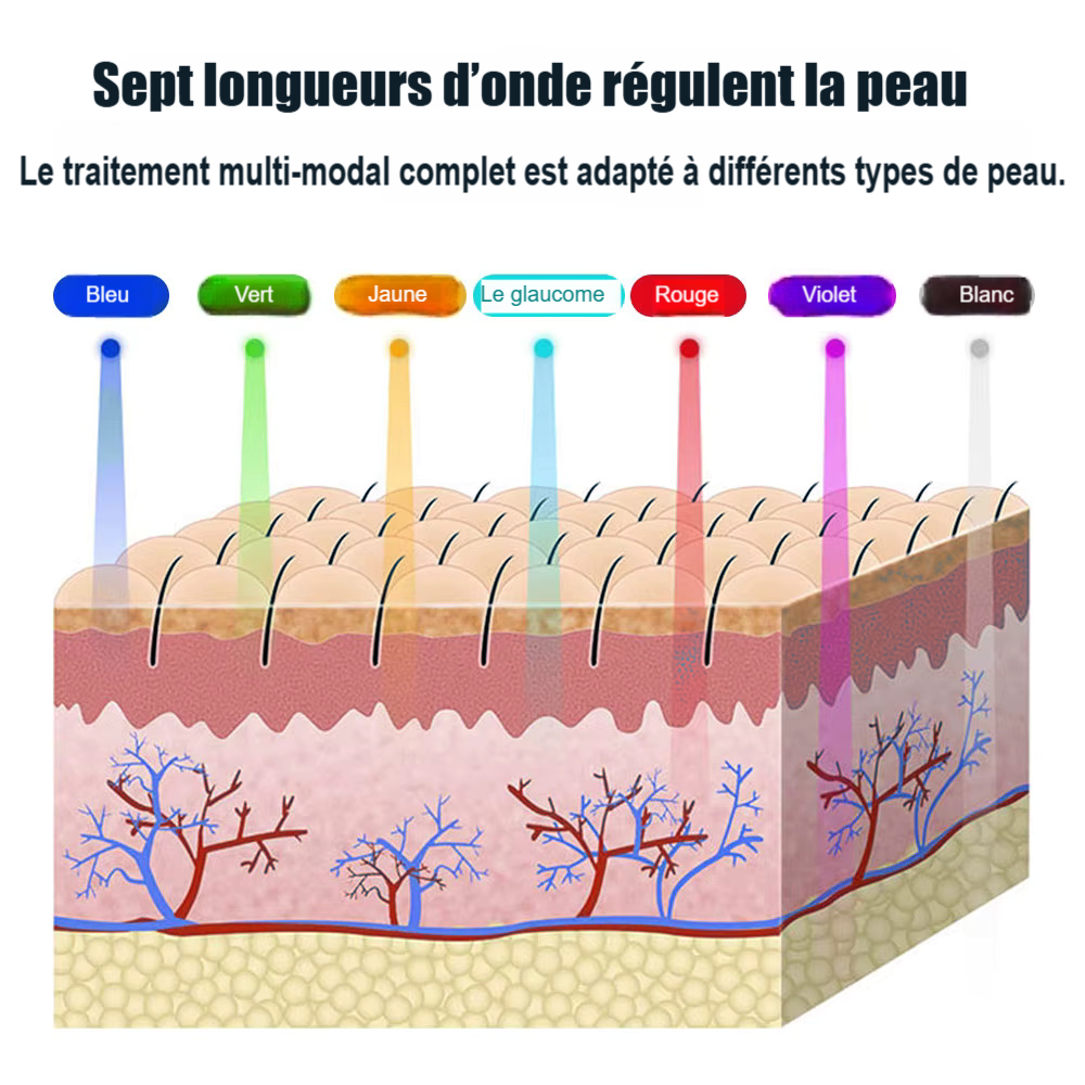 • Technologie avancée à 7 couleurs LED : Chaque teinte cible un problème spécifique, du rouge pour la production de collagène au bleu pour combattre l’acné, offrant ainsi une solution complète adaptée à tous les besoins.